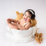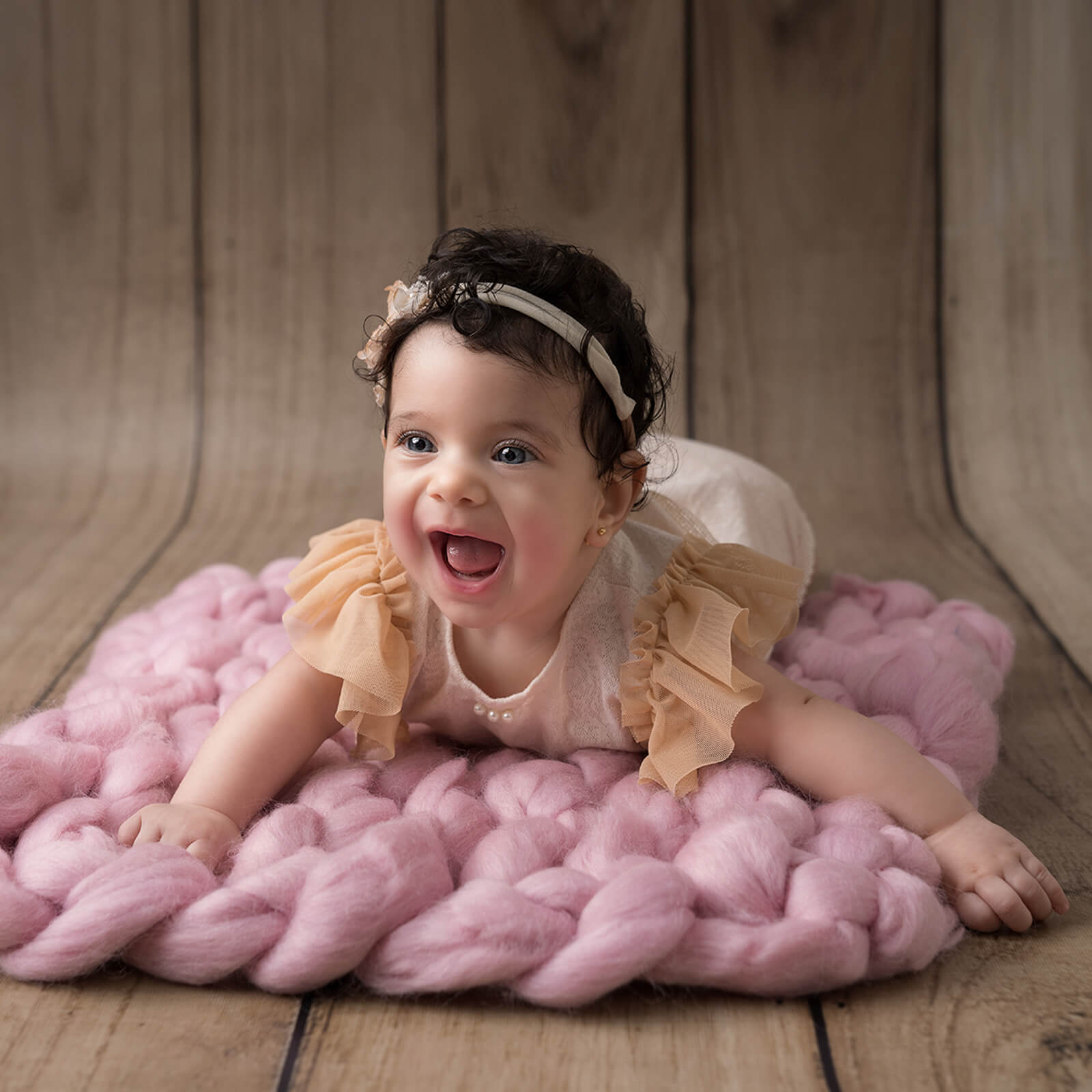 Hay dos etapas bien marcadas para aprovechar a retratar. Una es entre los 4 y 6 meses aproximadamente que es cuando lo bebes aun no se sientan pero estando boca abajo levantan la cabecita y la otra es estando boca arriba se agarran los piecitos. Son dos poses adorables para hacerles fotos, ademas suelen mirar a la cámara y sonríen un montón!